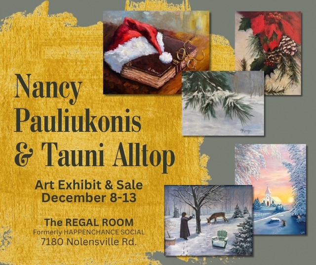 Come out Monday evening Dec. 8th to meet the artists and enjoy some refreshments from Regal Room’s delicious menu.